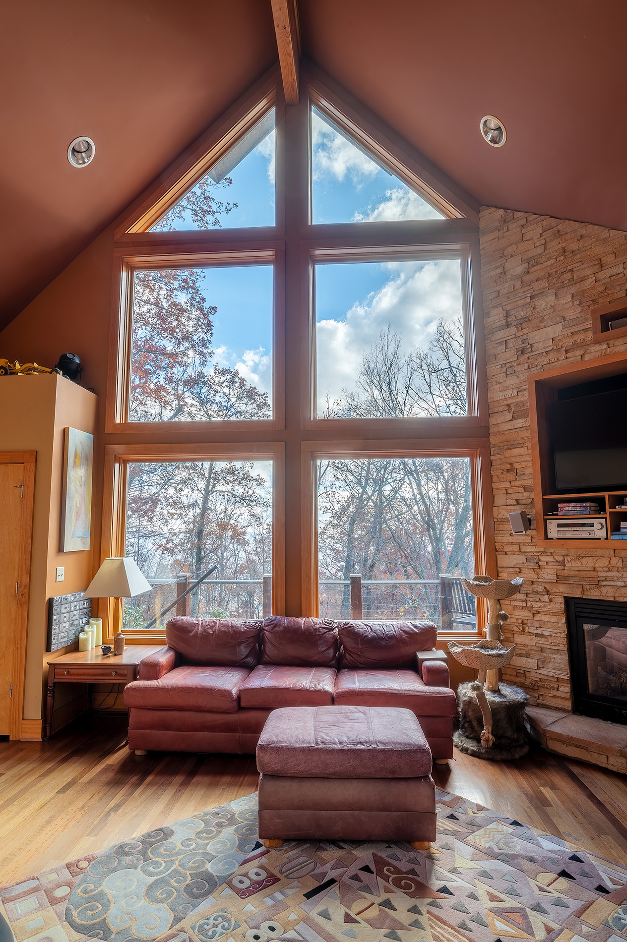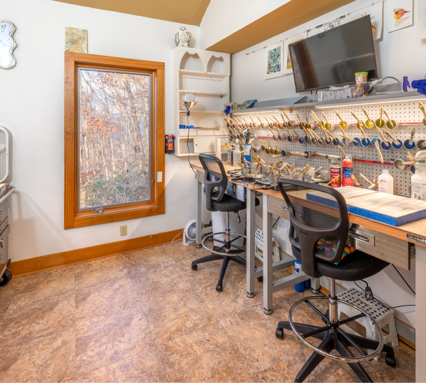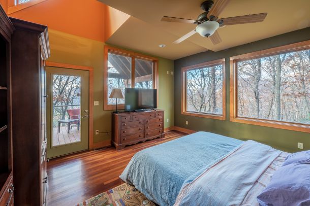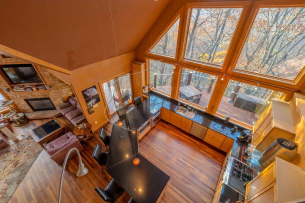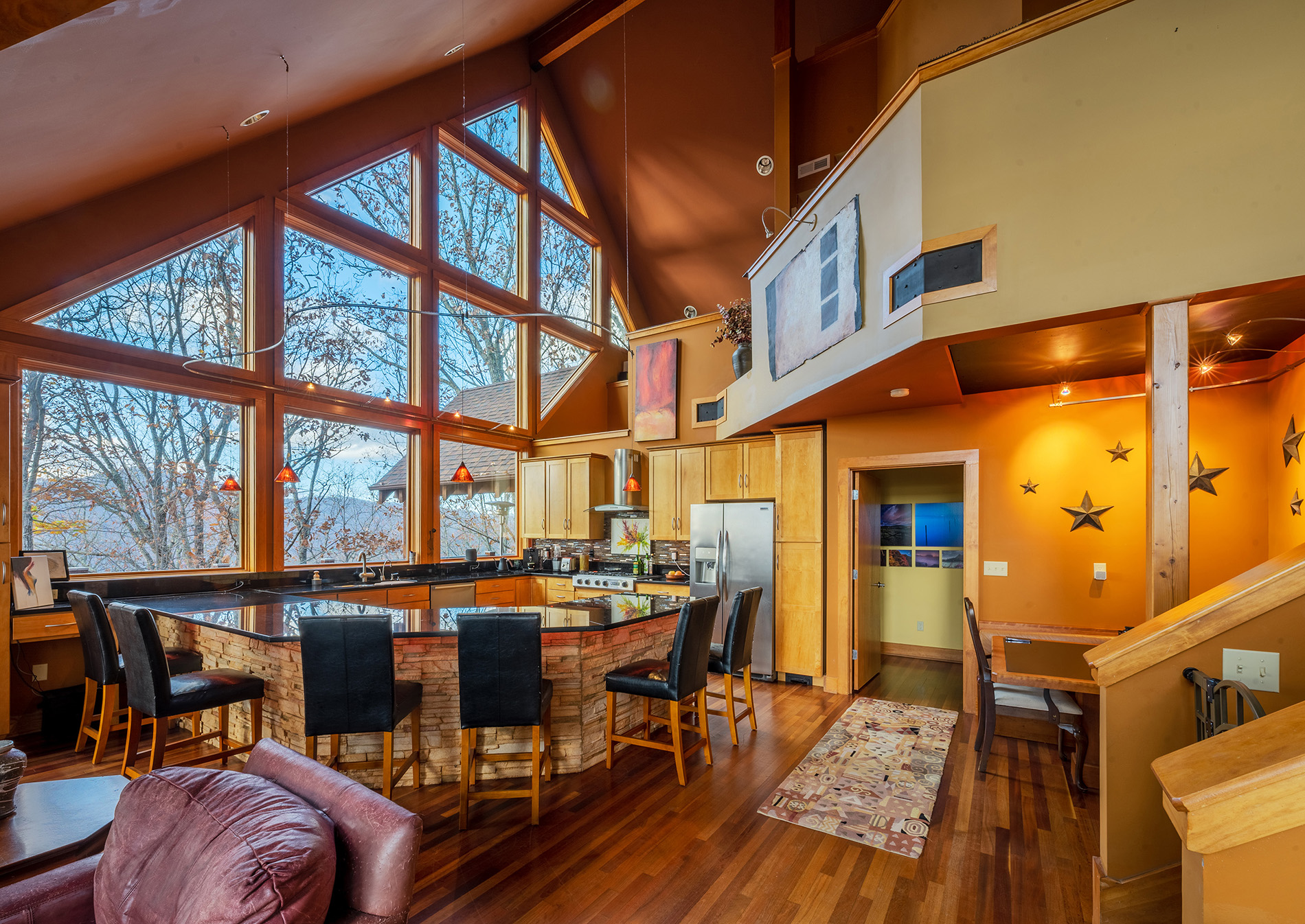 Custom designed architecture offers a stunning interior like no other. Two full walls of windows grace both the kitchen and living area. The tallest wall of windows won an Asheville Parade of Homes special award and reaches an astounding 29 feet offering endless mountain views.